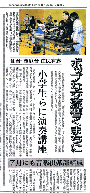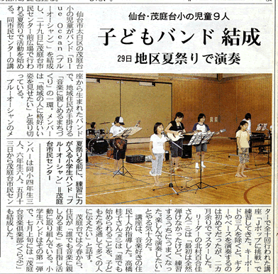 町内の音楽仲間で結成したバンドが中心になり小学生バンドを立ち上げて指導。河北新報より取材を受けて夕刊にカラー写真付きの5段組で紹介されました。子ども達は短時間で上手になって無事夏祭りで披露するまで至った。曲目はスピッツのチェリーでした。小学生のセンスには驚きました。